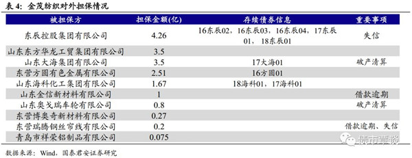 18年金茂自身主營(yíng)業(yè)務(wù)承壓的情況下,巨額對(duì)外擔(dān)保的風(fēng)險(xiǎn)暴露,導(dǎo)致企業(yè)流動(dòng)性緊張,最終出現(xiàn)違約。截至2018年6月末,金茂紡織對(duì)外擔(dān)保余額為19.33億元,占當(dāng)期期末凈資產(chǎn)的19.23%,擔(dān)保規(guī)模較大。被擔(dān)保企業(yè)主要是位于山東省東營(yíng)市的民營(yíng)企業(yè),區(qū)域較為集中,且所處行業(yè)集中在周期性較強(qiáng)的有色金屬、化工等行業(yè),在宏觀經(jīng)濟(jì)增速放緩的背景下,代償風(fēng)險(xiǎn)大,金茂紡織的對(duì)外擔(dān)保有極高的風(fēng)險(xiǎn)傳導(dǎo)性。被擔(dān)保企業(yè)山東大海集團(tuán)有限公司和奧戈瑞車輪集團(tuán)有限公司的信用風(fēng)險(xiǎn)已經(jīng)暴露:奧戈瑞于今年7月10日宣布進(jìn)入破產(chǎn)重組階段,公司為其擔(dān)保0.8億;11月26日,山東大海向東營(yíng)法院申請(qǐng)重整,金茂紡織為其擔(dān)保3.5億元。金茂紡織在尚且自顧不暇的情況下,又受巨額對(duì)外擔(dān)保的拖累,資金鏈斷裂,企業(yè)無(wú)法正常經(jīng)營(yíng)運(yùn)轉(zhuǎn),于在11月26日宣告破產(chǎn)重整。