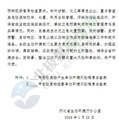 近日,河北省生態(tài)環(huán)境廳發(fā)布了關于春節(jié)期間加強危險廢物領域環(huán)境風險防控工作的緊急通知,要求加大涉危險廢物領域重點行業(yè)企業(yè)的環(huán)境監(jiān)管力度,2月份,全省暫停實施跨界危險廢物轉運,特殊情況必須轉移的,一事一報。詳情如下: