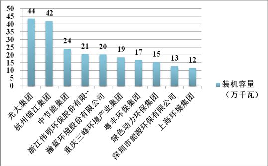 當(dāng)前我國垃圾焚燒發(fā)電行業(yè)市場競爭主體主要為大型國資背景企業(yè)和優(yōu)秀民營企業(yè)。2016年裝機(jī)容量排名前10名的垃圾焚燒發(fā)電投資企業(yè)依次為中國光大國際有限公司(43.53萬千瓦)、杭州錦江集團(tuán)(41.9萬千瓦)、中國節(jié)能集團(tuán)(24.1萬千瓦)、浙江偉明環(huán)保股份有限公司(20.55萬千瓦)、瀚藍(lán)環(huán)境股份有限公司(20萬千瓦)、重慶三峰環(huán)境產(chǎn)業(yè)集團(tuán)有限公司(18.6萬千瓦)、粵豐環(huán)保集團(tuán)(16.8萬千瓦)、綠色動力環(huán)保集團(tuán)股份有限公司(15.45萬千瓦)、深圳市能源環(huán)保有限公司(12.85千瓦)、上海環(huán)境集團(tuán)(11.7萬千瓦)和北京控股有限公司(11.55萬千瓦),具體詳見圖6。