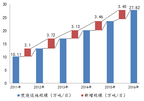 圖3 2011-2016年垃圾焚燒設(shè)施規(guī)模新增情況