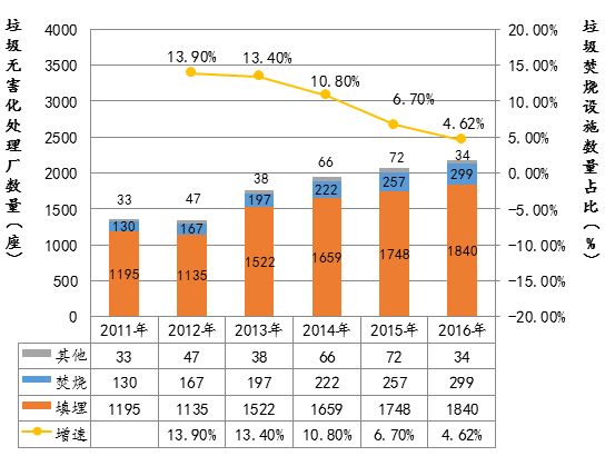 圖2 2011-2016年全國城鎮(zhèn)生活垃圾無害化處理設(shè)施數(shù)量