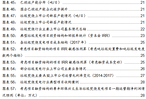 情景:考慮項(xiàng)目融資結(jié)構(gòu)的資本金IRR測(cè)算:我們假設(shè)項(xiàng)目的資本結(jié)構(gòu)為70%債務(wù),30%自有資金,參考中國(guó)天楹/綠色動(dòng)力的公司財(cái)務(wù)狀況,假設(shè)其項(xiàng)目的債務(wù)資金的綜合成本分別為6.5%/5.6%,各個(gè)項(xiàng)目每年將新增部分財(cái)務(wù)費(fèi)用,我們計(jì)算得到各個(gè)項(xiàng)目慮融資杠桿后的IRR,其中最高的為綠色動(dòng)力海寧項(xiàng)目IRR為30.0%,主因?yàn)槠鋰嵗l(fā)電量和噸投資額均為所列示可比項(xiàng)目最低。中國(guó)天楹延吉項(xiàng)目和康恒廣水項(xiàng)目IRR相對(duì)較低分別為17.1%/20.3%,主因其垃圾處置費(fèi)明顯較低,且中國(guó)天楹延吉項(xiàng)目噸垃圾發(fā)電量顯著低于其他項(xiàng)目。根據(jù)我們的敏感性分析,假設(shè)垃圾處置費(fèi)增加5元/噸,各個(gè)垃圾發(fā)電項(xiàng)目IRR增加0.6 pct -0.9pct;噸垃圾發(fā)電+20千瓦時(shí)/噸,各個(gè)項(xiàng)目的IRR增加.5pct ~2.3 pct。
