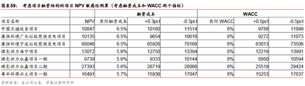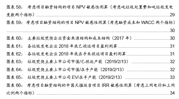 典型項(xiàng)目的NPV考慮項(xiàng)目融資結(jié)構(gòu)的項(xiàng)目NPV測(cè)算:我們假設(shè)項(xiàng)目的資本結(jié)構(gòu)為70%債務(wù),30%自有資金,參考中國(guó)天楹/綠色動(dòng)力的公司財(cái)務(wù)狀況,假設(shè)其項(xiàng)目的債務(wù)資金的綜合成本分別為6.5%/5.6%,各個(gè)項(xiàng)目每年將新增部分財(cái)務(wù)費(fèi)用。依據(jù)之前的投資數(shù)據(jù)和現(xiàn)金流數(shù)據(jù),我們計(jì)算得到各個(gè)項(xiàng)目考慮融資杠桿后的NPV,其中最高的為康恒寧波項(xiàng)目,其N(xiāo)PV為6.8億元,主要是因?yàn)槠鋰嵗幹觅M(fèi)高于其他所有項(xiàng)目,并且噸垃圾發(fā)電量也處于相對(duì)較高水平;而天楹延吉項(xiàng)目、康恒廣水項(xiàng)目、綠色動(dòng)力海寧、綠色動(dòng)力永嘉項(xiàng)目一期的NPV均較低,分別為1.08億元、1.01億元、1.31億元、0.97億元,主要因?yàn)榍皟蓚€(gè)項(xiàng)目的噸垃圾處置費(fèi)和噸垃圾發(fā)電量均較低,而后兩個(gè)項(xiàng)目的噸垃圾處置費(fèi)較低。我們?cè)俅斡?jì)算了各項(xiàng)目的單位產(chǎn)能NPV,發(fā)現(xiàn)天楹延吉項(xiàng)目、康恒廣水項(xiàng)目、綠色動(dòng)力永嘉項(xiàng)目一期的該指標(biāo)分別僅有13.56萬(wàn)元/噸、16.89萬(wàn)元/噸、19.48萬(wàn)元/噸,而康恒寧波項(xiàng)目、綠色動(dòng)力永嘉項(xiàng)目二期、綠色動(dòng)力海寧項(xiàng)目則分別達(dá)到30.24萬(wàn)元/噸、28.83萬(wàn)元/噸、26.14萬(wàn)元/噸,再一次反映了后三個(gè)項(xiàng)目相對(duì)更高的噸垃圾處置費(fèi)和噸垃圾發(fā)電量所帶來(lái)的更高的項(xiàng)目?jī)r(jià)值。根據(jù)我們的敏感性分析,假設(shè)垃圾處置費(fèi)增加5元/噸,各個(gè)垃圾發(fā)電項(xiàng)目的NPV增加410-2809萬(wàn)元;噸垃圾發(fā)電增加20千瓦時(shí)/噸,各個(gè)項(xiàng)目的NPV增加區(qū)間為611-4830萬(wàn)元。我們考慮融資成本和WACC兩個(gè)指標(biāo)再次對(duì)各個(gè)項(xiàng)目的NPV進(jìn)行敏感性分析,發(fā)現(xiàn)融資成本增加0.3pct時(shí), 各個(gè)項(xiàng)目的NPV降低322萬(wàn)元-2120萬(wàn)元;WACC增加0.5pct時(shí),各個(gè)項(xiàng)目的NPV降低789萬(wàn)元-5033萬(wàn)元。