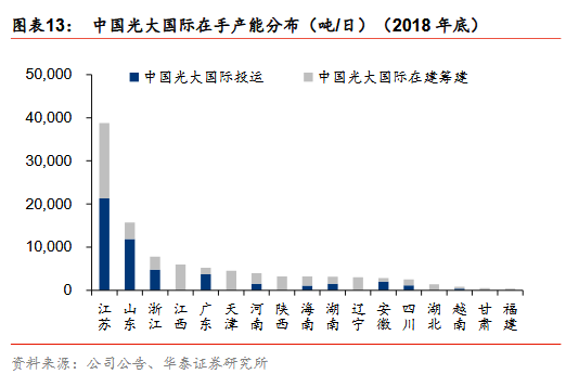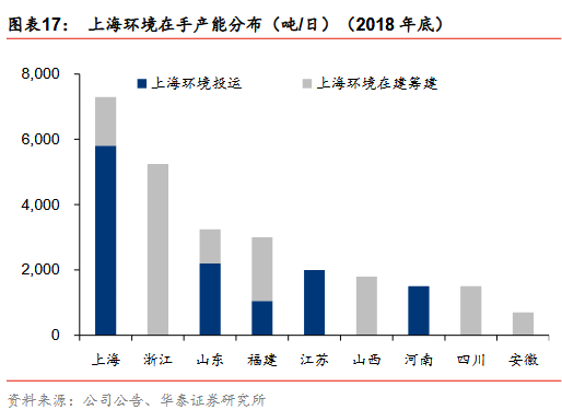 產(chǎn)能加速釋放:17年城市新增4.2萬(wàn)噸/日(2012-2016年均新增3.2萬(wàn)噸/日);17縣城投運(yùn)速度提速,我們估計(jì)17新增3.2萬(wàn)噸/日(十二五年均新增0.4萬(wàn)噸/日)。按照選取典型上市公司(18年已投運(yùn)產(chǎn)能市占率29%)投產(chǎn)規(guī)劃,18-20年累計(jì)投運(yùn)增速24%/24%/33% vs 按照十三五規(guī)劃測(cè)算18-20年累計(jì)投運(yùn)產(chǎn)能增速23%/19%/16%,上市公司投產(chǎn)增速高于行業(yè)增速,表明1)行業(yè)增速可能超預(yù)期或 ;2)上市公司已投運(yùn)市占率將提升。分區(qū)域:山東/上海/寧夏等省市提前完成十三五目標(biāo),廣東/北京/安徽/江蘇等19-20年仍具較大空間,中西部新增投運(yùn)崛起,東部部分地區(qū)仍有空間。