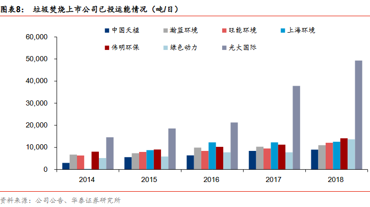 按上市公司規(guī)劃的投產(chǎn)進(jìn)度,2019-2020年為投產(chǎn)高峰期,2019-2020年新增投運(yùn)產(chǎn)能同比增速將高達(dá)24%、72%;18-20年累計(jì)投運(yùn)增速24%/24%/33%,高成長(zhǎng)可期。上述典型垃圾焚燒上市公司的規(guī)劃新增產(chǎn)能將在2019-2020年間大規(guī)模釋放,目前處于在建和籌建階段的項(xiàng)目將會(huì)集中投產(chǎn),預(yù)計(jì)2019-2020年新增投運(yùn)總產(chǎn)能將分別達(dá)到2.9萬(wàn)噸/日、5.0萬(wàn)噸/日;其中光大國(guó)際、綠色動(dòng)力、旺能環(huán)境、中國(guó)天楹、上海環(huán)境等新增產(chǎn)能居前。