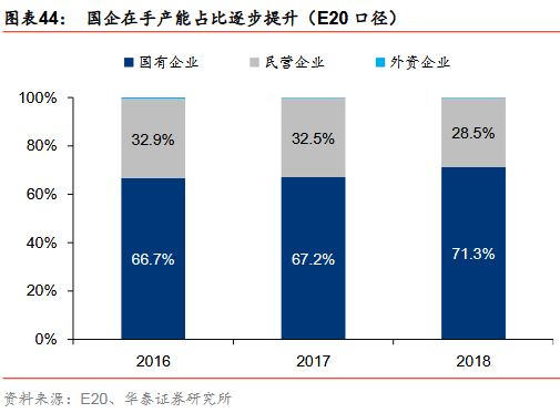 垃圾焚燒行業(yè)的參與者以國(guó)企和民企為主,國(guó)企在手產(chǎn)能市占率提升明顯,由16年的66.7%提升至18年的71.3%。從在手項(xiàng)目量(E20口徑)的角度看,2018年國(guó)企市占率大約71.3%,民企市占率大約28.5%,外企市占率大約0.2%。且從變化趨勢(shì)上看,國(guó)企在手產(chǎn)能市占率提升明顯,由16年的66.7%提升至18年的71.3%,主要與國(guó)企的資金優(yōu)勢(shì)、拿單優(yōu)勢(shì)相關(guān)聯(lián)。