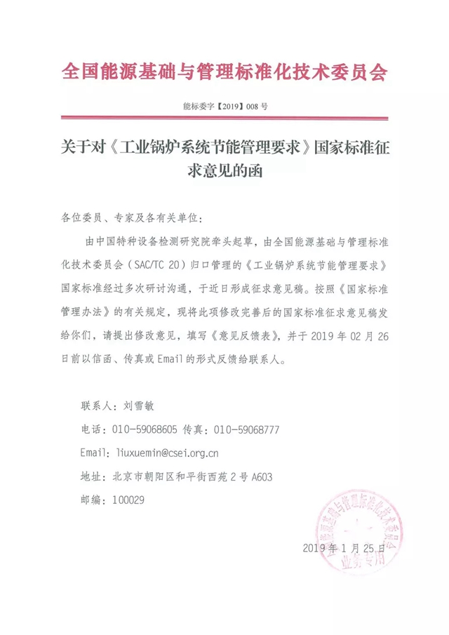 由中國(guó)特種設(shè)備檢測(cè)研究院牽頭起草,由全國(guó)能源基礎(chǔ)與管理標(biāo)準(zhǔn)化技術(shù)委員會(huì)(SAC/TC 20)歸口管理的《工業(yè)鍋爐系統(tǒng)節(jié)能管理要求》國(guó)家標(biāo)準(zhǔn)經(jīng)過多次研討溝通,于近日形成征求意見稿。按照《國(guó)家標(biāo)準(zhǔn)管理辦法》的有關(guān)規(guī)定,現(xiàn)將此項(xiàng)修改完善后的國(guó)家標(biāo)準(zhǔn)征求意見稿發(fā)給你們,請(qǐng)?zhí)岢鲂薷囊庖?,填寫《意見反饋表》,并?019年02月26日前以信函、傳真或Email的形式反饋給聯(lián)系人。