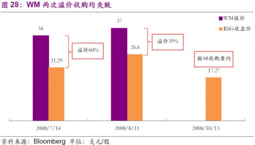 值得注意的是公司發(fā)起收購的時間。2008年6月23日,RSG宣布將與Allied Waste合并,而當時Allied Waste和RSG分別是美國第二、第三大固廢公司。消息宣布后一個月內(nèi),WM就向RSG提出了收購要約,但未能實現(xiàn)。
