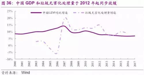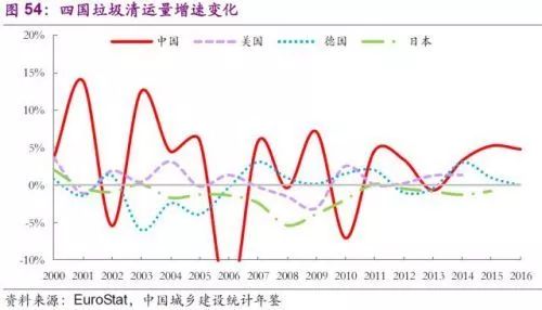 增速方面,美國近30年間雖持續(xù)增長,但復(fù)合年均增速不足1%;德國基本實現(xiàn)固廢0增長;日本更是從2000年起連年實現(xiàn)固廢負增長。中國近30年復(fù)合年均增速略超5%,近7年基本維持在4%左右。按照《“十三五”全國城鎮(zhèn)化生活垃圾無害化處理設(shè)施建設(shè)規(guī)劃》,預(yù)計到2020年中國垃圾清運量將達4億噸,未來4年年均增速有望持續(xù)超10%。