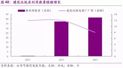 早在2000年初,公司便積極發(fā)展建筑垃圾的回收工作。公司在2009年至2014年間,通過10余家建筑垃圾回收廠占據(jù)了穩(wěn)定市場份額,建筑行業(yè)的季節(jié)性高峰特性也為公司在夏季的營業(yè)收入做出了可觀貢獻。而在2011年,公司又創(chuàng)新式的推出了“分散回收跟蹤工具”,通過跟蹤使用在工程中的重復(fù)利用建筑材料,幫助工程項目方更好地完成綠色建筑的目標。截止2015年,通過跟蹤工具的幫助,已有多達 41萬噸的建筑垃圾得到回收或再利用,比2013年的37萬噸增長10%。
