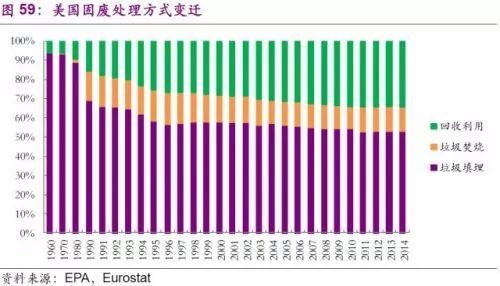 美國在經(jīng)歷了1980—2000年期間大規(guī)模的“去填埋化”后,近年來固廢處理方式較為穩(wěn)定,填埋仍是其主流處理方式,2014年占比近53%,垃圾焚燒和回收利用占比分別為13%和34%。由于垃圾焚燒有著處理成本較高,領(lǐng)避效應(yīng)等不利因素,該處理方式恐較難在美國進一步發(fā)展?;厥绽媚壳半m因分揀環(huán)節(jié)成本較高,導(dǎo)致近年來在美國的發(fā)展速度有所放緩,但是我們認為,隨著垃圾分類觀念的進一步普及,和龍頭企業(yè)市場化力度的進一步加大,美國回收利用處理占比有望進一步提升。