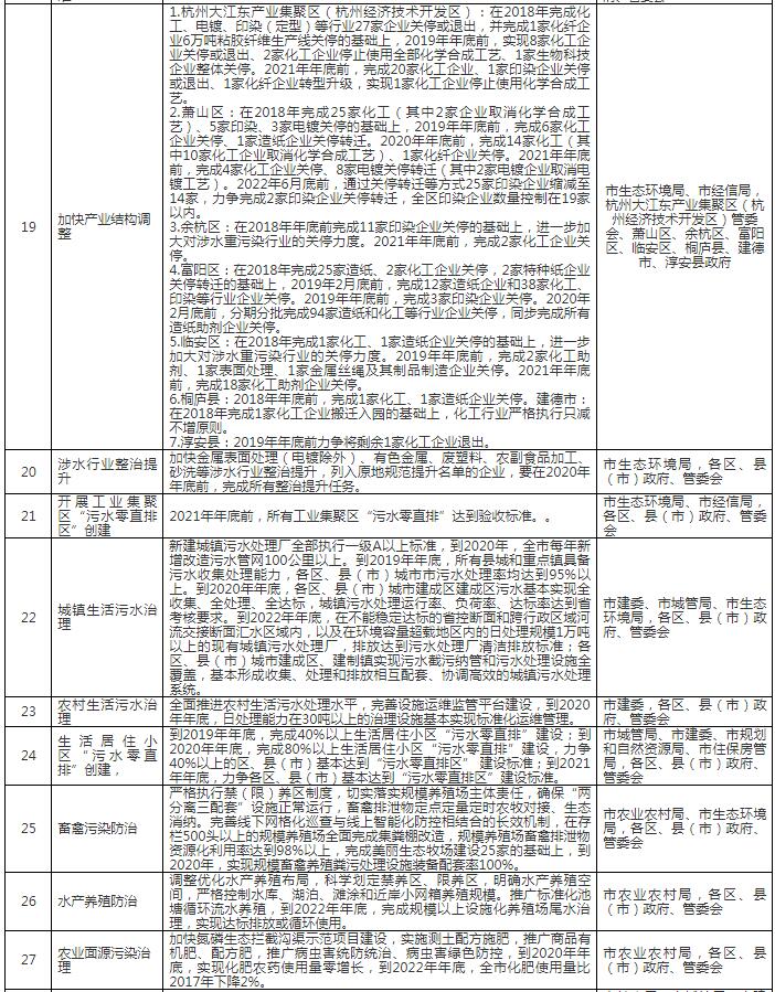 2.強(qiáng)化工業(yè)污染治理。制定涉水重污染行業(yè)“杭州標(biāo)準(zhǔn)”,到2020年,完成化工、印染、造紙等涉水重污染行業(yè)地方排放標(biāo)準(zhǔn)的制定。結(jié)合傳統(tǒng)產(chǎn)業(yè)改造提升行動(dòng),加快錢塘江流域化工、印染、造紙等企業(yè)或產(chǎn)能的搬遷改造,到2022年完成369家企業(yè)關(guān)停轉(zhuǎn)遷。加快金屬表面處理(電鍍除外)、有色金屬、廢塑料、農(nóng)副食品加工、砂洗等涉水行業(yè)整治提升,列入原地規(guī)范提升名單的企業(yè),要在2020年年底前完成所有整治提升任務(wù)。開展工業(yè)集聚區(qū)“污水零直排區(qū)”創(chuàng)建,2021年年底前,所有工業(yè)集聚區(qū)“污水零直排”達(dá)到驗(yàn)收標(biāo)準(zhǔn)。加快建立工業(yè)集聚區(qū)截污納管、雨污分流、排水許可證發(fā)放等管理的“一園一檔”。在全面完成重點(diǎn)排污單位自動(dòng)監(jiān)控設(shè)施安裝和聯(lián)網(wǎng)的基礎(chǔ)上,加強(qiáng)自動(dòng)監(jiān)控設(shè)施運(yùn)行管理,進(jìn)一步強(qiáng)化監(jiān)督執(zhí)法。