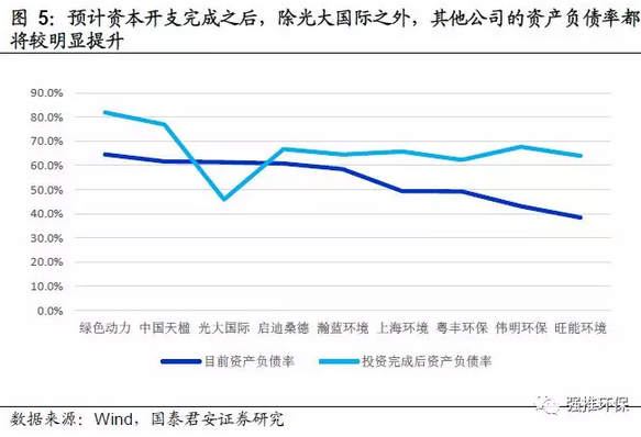 預(yù)計(jì)的資本開支完成之后資產(chǎn)負(fù)債率的計(jì)算方法:1)根據(jù)各公司目前的資產(chǎn)負(fù)債率和在手現(xiàn)金情況,假設(shè)不進(jìn)行新的股權(quán)融資,所有在手現(xiàn)金都投入新項(xiàng)目建設(shè),保守按照目前我們有統(tǒng)計(jì)數(shù)據(jù)的項(xiàng)目的平均資本金投入為28%來計(jì)算,預(yù)計(jì)除光大國際以外的其他公司新項(xiàng)目所需資本金投入都大于目前在手現(xiàn)金,因此統(tǒng)一假設(shè)項(xiàng)目除了在手現(xiàn)金投入的部分以外,都使用銀行貸款,我們對(duì)預(yù)計(jì)資本開支完成之后,公司的資產(chǎn)負(fù)債率水平進(jìn)行測(cè)算;2)由于各公司都有部分項(xiàng)目已經(jīng)在建,相應(yīng)的負(fù)債已體現(xiàn)在了目前的資產(chǎn)負(fù)債表中,且在手所有項(xiàng)目并非在同一時(shí)間內(nèi)開始投資,因此我們的計(jì)算結(jié)果將高于實(shí)際水平。