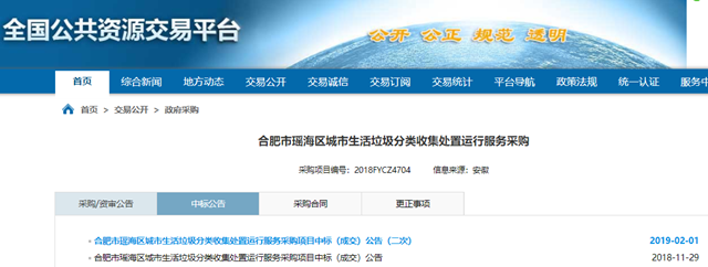 合肥市瑤海區(qū)城市生活垃圾分類收集處置運(yùn)行服務(wù)采購(gòu)項(xiàng)目發(fā)布二次中標(biāo)公告,浙江聯(lián)運(yùn)環(huán)境工程股份有限公司成為中標(biāo)的社會(huì)資本方,中標(biāo)金額為2094.96萬(wàn)(3年服務(wù)期)。