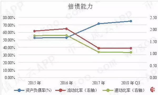 盛運(yùn)環(huán)保2015年末至2018年3季度末的資產(chǎn)負(fù)債率分別為52.54%、52.80%、71.40%和74.84%,一路飆升,說明公司的償債壓力越來越大。
