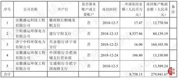 因?yàn)榍穫⒈黄鹪V等,盛運(yùn)環(huán)保及其子公司自2018年3月以來多個(gè)銀行賬戶被凍結(jié)。