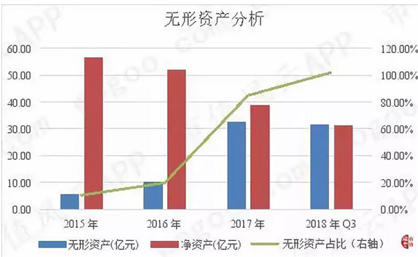 公司2015年末至2018年3季度末的無形資產(chǎn)金額分別為5.79億元、10.24億元、32.80億元和31.79億元,占公司凈資產(chǎn)的比例分別為10.25%、19.64%、84.28%和101.66%,占比持續(xù)增加,2018年3季度末甚至一度超過了公司的凈資產(chǎn)規(guī)模。