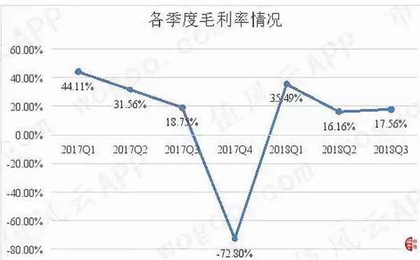 盛運(yùn)環(huán)保各季度的毛利率波動(dòng)比較大,比如2017年第一季度的毛利率為44.11%,2018年第一季度的毛利率為35.49%,而2017年第四季度的毛利率為-72.80%,2018年第二、三季度的毛利率分別為16.16%、17.56%,巨幅的毛利率波動(dòng)說明公司的毛利率存在異常波動(dòng)。