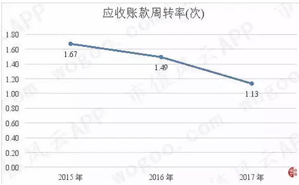 盛運(yùn)環(huán)保2015年至2017年的應(yīng)收賬款周轉(zhuǎn)率分別為1.67次、1.49次和1.13次,不斷下滑,說明公司的應(yīng)收賬款管理能力在持續(xù)下降。