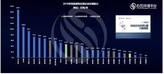 我國(guó)危廢行業(yè)仍處于發(fā)展期,類(lèi)似于美國(guó)危廢行業(yè)的二十世紀(jì)90 年代初期,行業(yè)仍呈現(xiàn)“小、散、亂”的局面。目前我國(guó)前十家企業(yè)集中度(CR10)參數(shù)值較低,在7%左右。下圖為2018年我國(guó)危廢行業(yè)主要企業(yè)處理能力的排名。