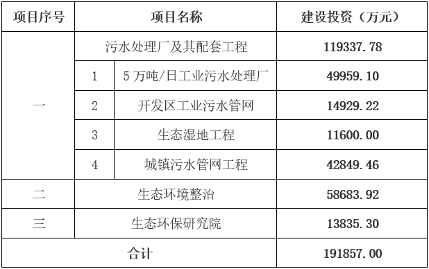 據(jù)悉,江蘇省泰興經(jīng)濟(jì)開(kāi)發(fā)區(qū)污水處理及生態(tài)環(huán)境提升PPP項(xiàng)目總投資約為204882.38萬(wàn)元,其中建設(shè)投資191857.00萬(wàn)元。根據(jù)本項(xiàng)目各子項(xiàng)的工程可行性研究報(bào)告,本項(xiàng)目的建設(shè)投資構(gòu)成詳見(jiàn)下表,最終總投資以建設(shè)期結(jié)束后經(jīng)審計(jì)的竣工決算額為準(zhǔn)。