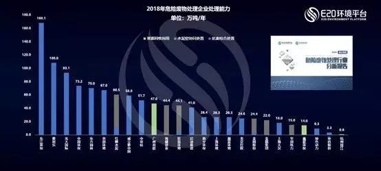 我國危廢行業(yè)仍處于發(fā)展期,類似于美國危廢行業(yè)的二十世紀90 年代初期,行業(yè)仍呈現(xiàn)“小、散、亂”的局面。目前我國前十家企業(yè)集中度(CR10)參數(shù)值較低,在7%左右。下圖為2018年我國危廢行業(yè)主要企業(yè)處理能力的排名。