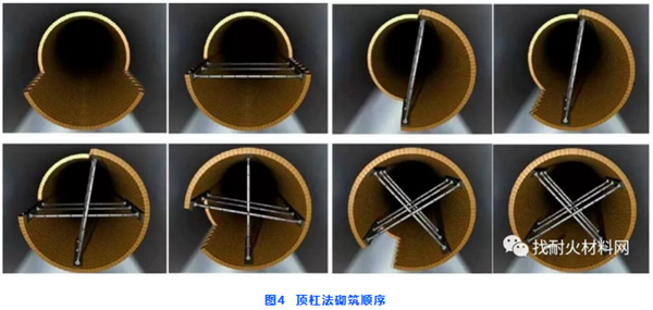 頂杠法適用于直徑小于4m的回轉(zhuǎn)窯,砌筑順序如圖4所示,從回轉(zhuǎn)窯底部開始向兩側(cè)砌筑,在回轉(zhuǎn)窯中心線部位用螺旋頂杠和木方壓實(shí)固定耐火磚,耐火磚砌筑時(shí)始終處于中心線以下,會(huì)因?yàn)樽陨淼闹亓o貼在回轉(zhuǎn)窯窯體內(nèi)壁:因?yàn)樵谄鲋r(shí)需要頻繁轉(zhuǎn)窯,所以頂杠法比較適用于直徑小于4m的窯體。