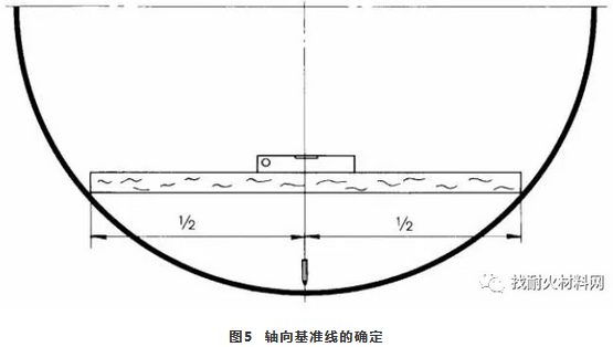 可以防止砌筑時(shí)磚環(huán)砌歪和磚列扭曲,同時(shí)可以控制耐火磚的磚縫厚度。首先確定軸向基準(zhǔn)線,可以采用水平儀、直尺和鉛錘確定,如圖5所示,軸向基準(zhǔn)線每隔1.5m畫一條,每條與窯的中心線平行;環(huán)向基準(zhǔn)線每隔1m畫一條,每條與窯的中心線垂直;