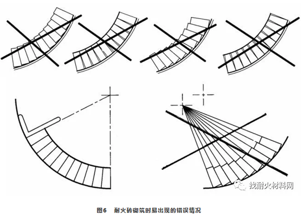 (3)砌筑時(shí)需保證耐火磚貼緊窯體內(nèi)壁,各耐火磚側(cè)面之間(環(huán)向)相互貼緊,隨時(shí)用橡皮錘或木錘敲擊找正來保證這兩項(xiàng)貼緊;不時(shí)檢查各環(huán)縫是否與環(huán)向基準(zhǔn)線平行,耐火磚的徑向方向線是否與窯體同心,各環(huán)耐火磚間不能存在“臺(tái)階”現(xiàn)象,磚縫不能出現(xiàn)楔形磚縫,如圖6所示: