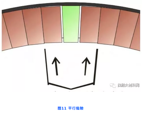 (7)使用鎖磚和鋼板鎖口時(shí)需注意,布置好鎖磚和標(biāo)準(zhǔn)磚后,注意觀察磚縫,若磚縫是水平,則在標(biāo)準(zhǔn)磚側(cè)面打入鋼板,不得在鎖磚側(cè)面打入鋼板,如圖11所示:若磚縫是楔型的,此時(shí)打入鋼板會(huì)導(dǎo)致耐火磚會(huì)出現(xiàn)應(yīng)力集中損壞,需要返工,如圖12所示: