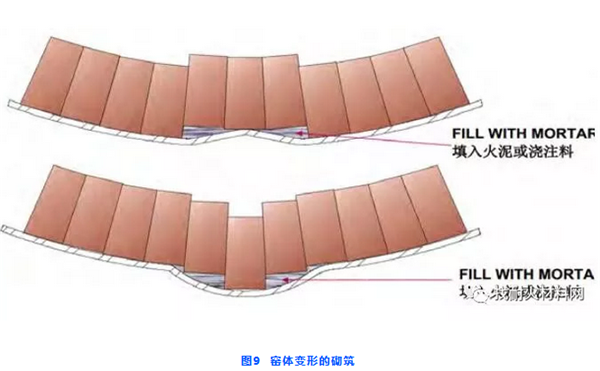 在窯體變形處砌筑時(shí),由于耐火磚不能于窯體貼緊,用耐火泥漿找平后進(jìn)行砌筑,軸向歪斜的耐火磚側(cè)面不能貼緊,采用耐火泥漿成陶瓷纖維板來調(diào)增,如圖9、10所示: