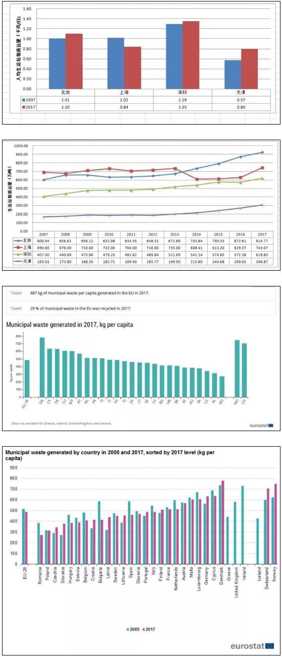 人均生活垃圾量是多是少,如何評價。有人說少好,少說明減量化做的好??礆W盟28個國家生活垃圾量統(tǒng)計,人均量多的國家往往生活垃圾管理水平高,生活垃圾回收利用利用率也高,如2017年歐洲生活垃圾量統(tǒng)計數(shù)據(jù):丹麥748千克/人·年,瑞士706千克/人·年,德國633千克/人·年;人均生活垃圾量少的國家往往經(jīng)濟水平低,生活垃圾回收率低,如羅馬尼亞272千克/人·年,塞爾維亞306千克/人·年;2017年瑞士生活垃圾回收利用率為53%,丹麥為48%,而羅馬尼亞只有13%。