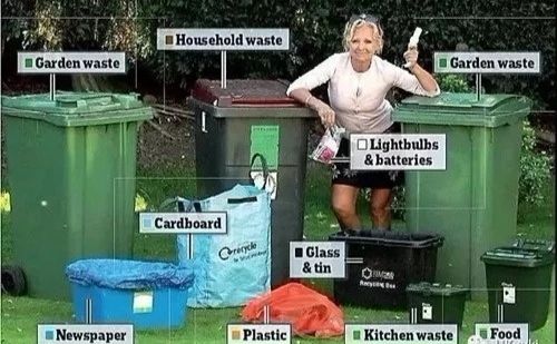 在英國,每家每戶都有至少3種顏色的帶滾輪垃圾桶,并且垃圾桶上還會有各家的門牌號碼。垃圾桶由Cherwell(相當(dāng)于中國的社區(qū)居委會)統(tǒng)一制作,居民自行購買。垃圾回收費(fèi)用為一年145鎊。每周回收的垃圾桶顏色不同,這周收綠桶,下周收藍(lán)色和褐色的桶。