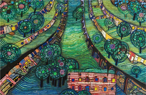 百水先生的作品充滿了溫和的螺旋,幾乎看不到一條直線。色彩斑斕又明亮,充滿了原始的童趣。他早年在戰(zhàn)爭的陰影之下長大,對于德國納粹的統(tǒng)一,整齊,規(guī)矩,充滿了厭惡和排斥的情緒。