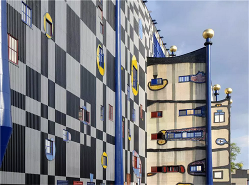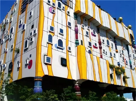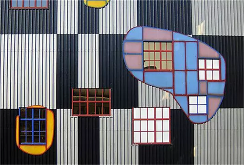 鮮艷的色塊斑斕無比,建筑再也不會(huì)“冷冰冰”;紅色與黃色的條紋象征著處理廠的火焰;五百多個(gè)形狀各異的窗戶裝飾著墻壁……這里就是一個(gè)按照百水先生世界觀建造的奇幻之地。