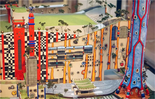 還有模型版本的設(shè)計(jì)圖。一如百水先生的風(fēng)格,漂亮的曲線,五彩的建筑,周圍,上下全部都是自然與調(diào)和。外部的配色看起詭異又十分瀟灑。
