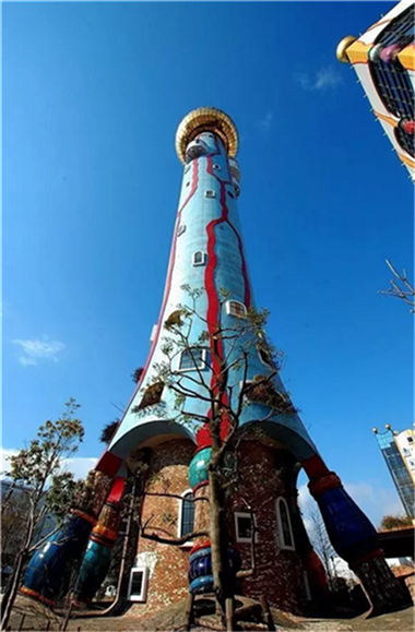所以作品都是一反常態(tài)的“特立獨(dú)行”,也充滿著童話的氣息。于是,在百水先生的手中,一座垃圾處理廠也變成了童話世界: