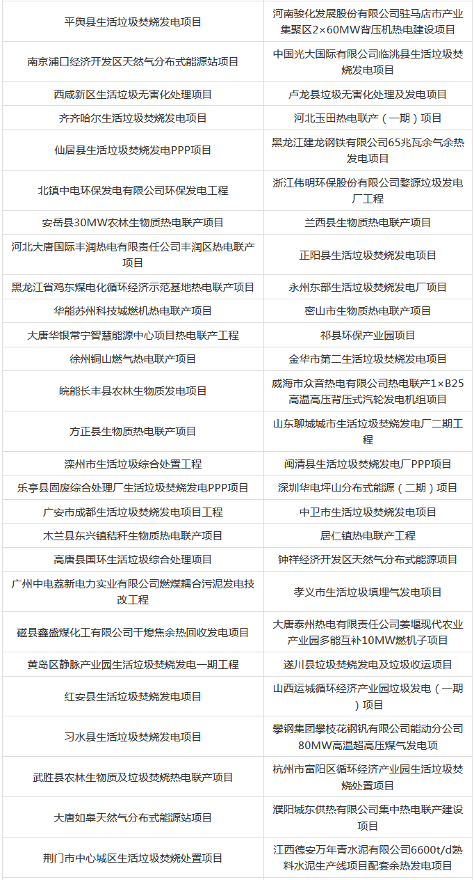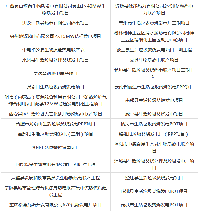 其中大部分為垃圾發(fā)電項目,涉及生物質(zhì)發(fā)電建設(shè)項目、生活垃圾焚燒發(fā)電項目、生物質(zhì)熱電聯(lián)產(chǎn)項目等,具體項目名單如下: