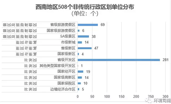 除了傳統(tǒng)的以區(qū)縣為基本單位的行政區(qū)劃單位外,西南五省市區(qū)還有508個各類非傳統(tǒng)行政區(qū)劃單位,包括各類國家級、省市級的經(jīng)開區(qū)、開發(fā)區(qū)、高新區(qū)、新區(qū)、新城、5A級景區(qū)及旅游度假區(qū)。