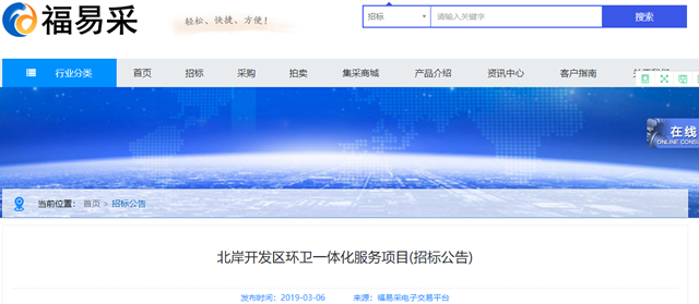 福建省北岸開發(fā)區(qū)環(huán)衛(wèi)一體化服務(wù)項目發(fā)布招標公告。
