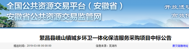 原標(biāo)題:1000萬安徽省繁昌縣峨山鎮(zhèn)城鄉(xiāng)環(huán)衛(wèi)一體化項目中標(biāo)公示