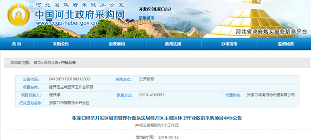 張家口經(jīng)開區(qū)主城區(qū)環(huán)衛(wèi)作業(yè)政府采購項目發(fā)布中標公告,北京環(huán)境有限公司成為中標的社會資本方,中標金額3522.68萬/年,服務(wù)期限3年,期限內(nèi)項目總金額達1.06億。