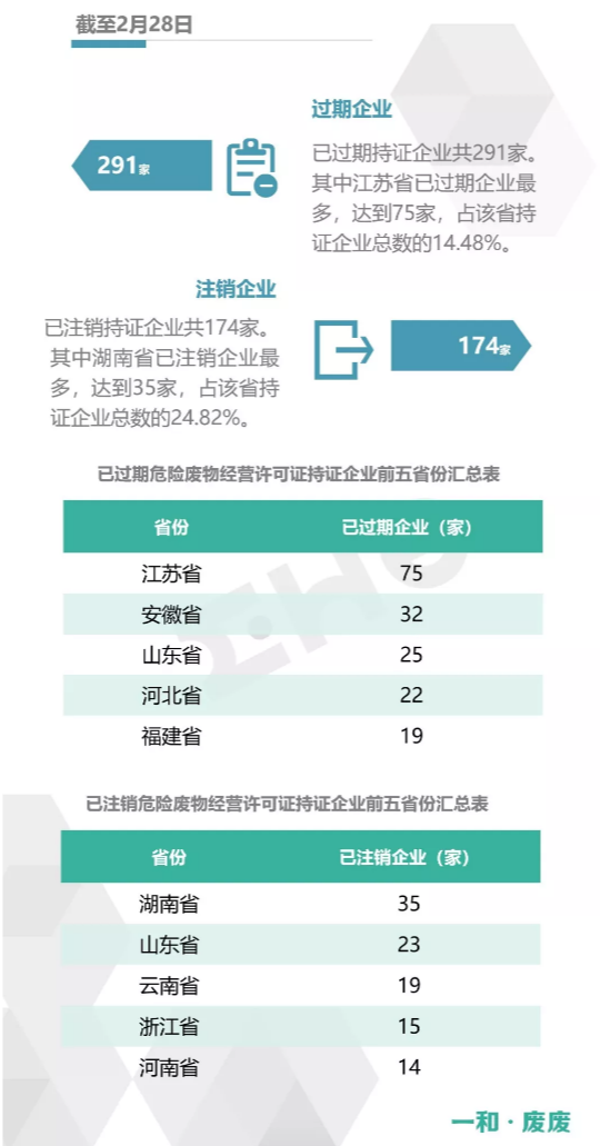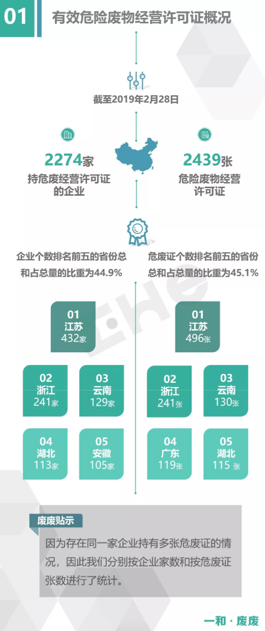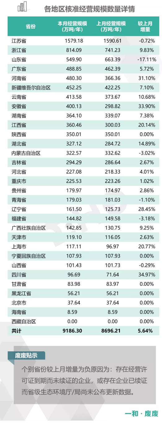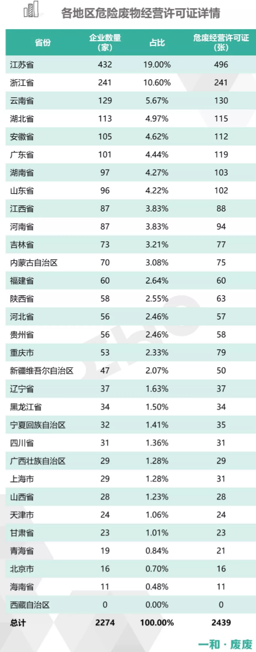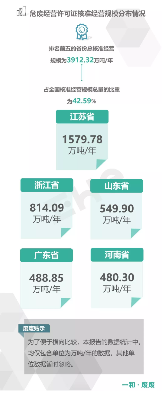 2.統(tǒng)計范圍:本次數(shù)據(jù)收集統(tǒng)計的范圍為省級生態(tài)環(huán)境廳(局)官方公布的持有危險廢物經(jīng)營許可證企業(yè)的數(shù)據(jù),因此由地級市發(fā)布的醫(yī)療廢物經(jīng)營許可證、收集經(jīng)營許可證,且未納入省級生態(tài)環(huán)境廳(局)公布數(shù)據(jù)的部分,并未計入統(tǒng)計數(shù)據(jù)中。