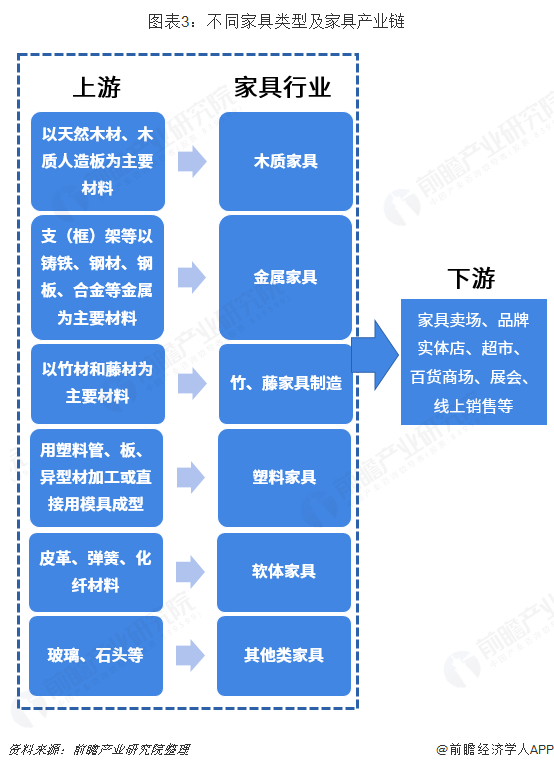 根據(jù)《國民經(jīng)濟(jì)產(chǎn)業(yè)分類》中,家具制造業(yè)是指用木材、金屬、塑料、竹、藤等材料制作的,具有坐臥、憑倚、儲(chǔ)藏、間隔等功能,可用于住宅、旅館、辦公室、學(xué)校、餐館、醫(yī)院、劇場(chǎng)、公園、船艦、飛機(jī)、機(jī)動(dòng)車等任何場(chǎng)所的各種家具的制造。按照家具其主要使用材料進(jìn)行分類,包括木質(zhì)家具、金屬家具、竹藤家具、塑料家具及其他家具類型,其對(duì)應(yīng)的下游包括家具賣場(chǎng)、品牌實(shí)體店、超市、百貨商場(chǎng)、展會(huì)及線上銷售等。