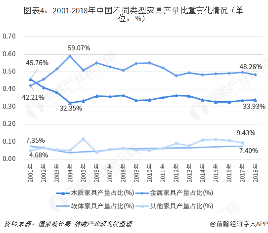 從2001-2018年中國不同類型家具產(chǎn)量占比變化情況看,中國生產(chǎn)的家具以木質(zhì)家具和金屬家具為主,軟體家具、竹藤類家具、塑料家具等所占比重較??;2001年以后,金屬家具產(chǎn)量比重就超過了木質(zhì)家具,金屬家具產(chǎn)量比重基本保持在50%上下,木質(zhì)家具產(chǎn)量比重保持在35%上下。