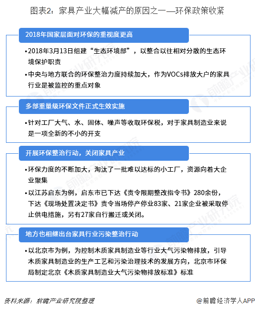 2018年家具產(chǎn)量大幅減產(chǎn)的原因之一是環(huán)保政策的陸續(xù)出臺(tái)。環(huán)保政策的收緊,國家及地區(qū)對(duì)木質(zhì)家具企業(yè)的污染問題、甲醛問題等陸續(xù)進(jìn)入進(jìn)入整治階段,中小家具企業(yè)陸續(xù)倒閉,家具行業(yè)數(shù)量減少,導(dǎo)致全國總產(chǎn)量減少。2018年國家層面對(duì)環(huán)保的重視度更高:2018年3月13日組建“生態(tài)環(huán)境部”,以整合以往相對(duì)分散的生態(tài)環(huán)境保護(hù)職責(zé);中央與地方聯(lián)合的環(huán)保整治力度持續(xù)加大,作為VOCs排放大戶的家具行業(yè)是被監(jiān)控的重點(diǎn)對(duì)象;多部重量級(jí)環(huán)保文件正式生效實(shí)施:針對(duì)大氣污染治理、水污染治理、固廢污染治理、噪聲污染治理等收取環(huán)保稅,對(duì)于家具制造業(yè)來說是一項(xiàng)全新的不小的開支。環(huán)保力度的不斷加大,淘汰了一批難以達(dá)標(biāo)的小工廠,資源向著大企業(yè)聚集;以江蘇啟東為例,啟東市已下達(dá)《責(zé)令限期整改指令書》280余份,下達(dá)《現(xiàn)場(chǎng)處置決定書》責(zé)令當(dāng)場(chǎng)停產(chǎn)停業(yè)83家、21家企業(yè)被企業(yè)被采取停止供電措施,另有27家自行搬遷或關(guān)閉……