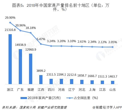 從家具產(chǎn)量整體情況看,2018年中國家具產(chǎn)量排名前十的地區(qū)有浙江、廣東、福建、江西、四川、河南、遼寧、河北、上海、江蘇和山東,有7個(gè)是東部地區(qū)。其中浙江省產(chǎn)量高達(dá)2.13億件,占比29.90%,排名第一;廣東地區(qū)產(chǎn)量排名第二,占比20.96%;福建排名第三,占比18.18%。
