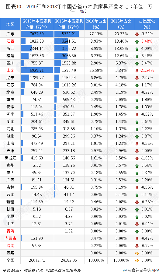 第一,部分地區(qū)木質(zhì)家具從無到有、從有到無;有中小木質(zhì)家具企業(yè)入駐青海,2018年產(chǎn)量達(dá)到1.02萬輛;內(nèi)蒙古和海南的木質(zhì)家具產(chǎn)業(yè)陸續(xù)遷出,2018年產(chǎn)量為零。