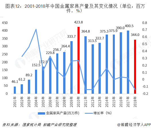 根據(jù)國家統(tǒng)計(jì)局統(tǒng)計(jì),金屬家具的發(fā)展階段與家具行業(yè)整體發(fā)展歷程十分相似;2001-2010年處于行業(yè)增長期,2010年金屬家具產(chǎn)量達(dá)到423.8百萬件,達(dá)到歷史最高;2011-2018年行業(yè)處于調(diào)整期,產(chǎn)量漲跌幅度較大。2018年中國家具總產(chǎn)量下降94.26百萬件,僅金屬產(chǎn)量2018年就大幅減產(chǎn)56.51百萬輛,貢獻(xiàn)率高達(dá)60%。
