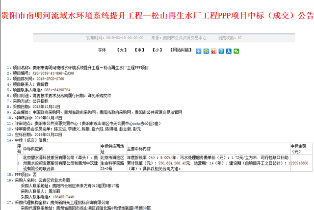 北京碧水源科技股份有限公司(牽頭)、貴州貴水投資發(fā)展股份有限公司和貴州中筑建設(shè)有限公司聯(lián)合體中標貴陽市南明河流域水環(huán)境系統(tǒng)提升工程—松山再生水廠工程PPP項目,中標金額為22021.56萬元。